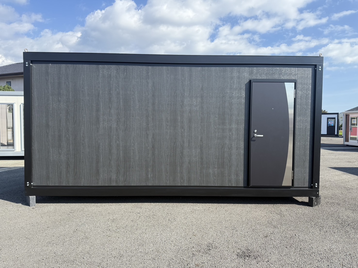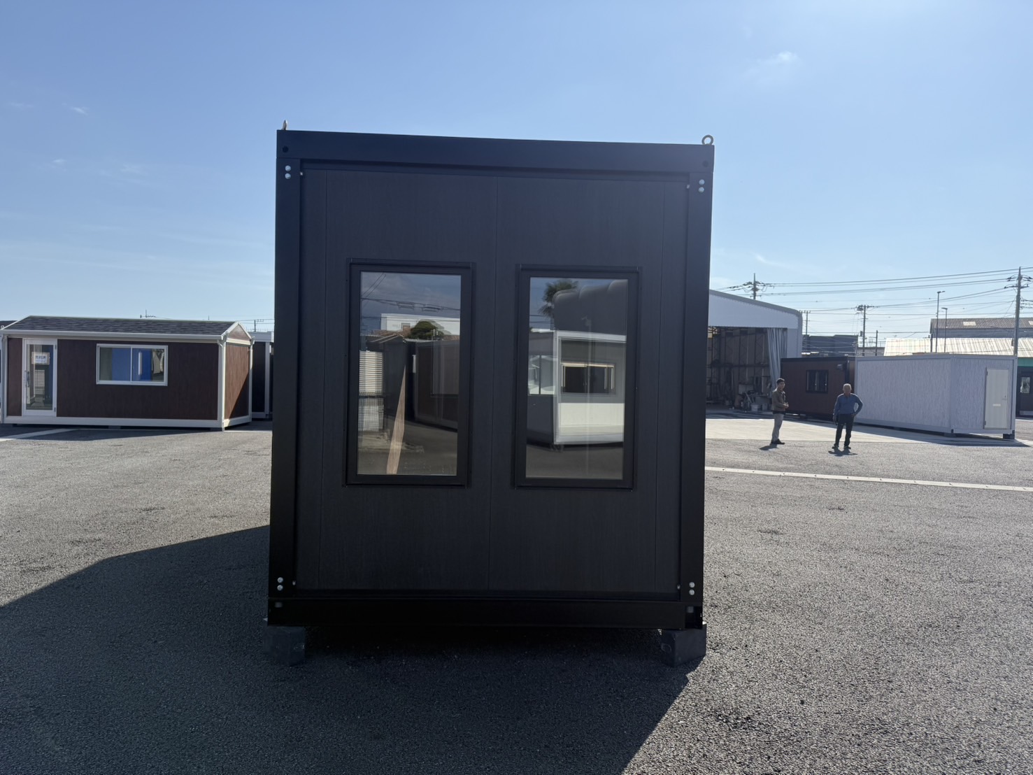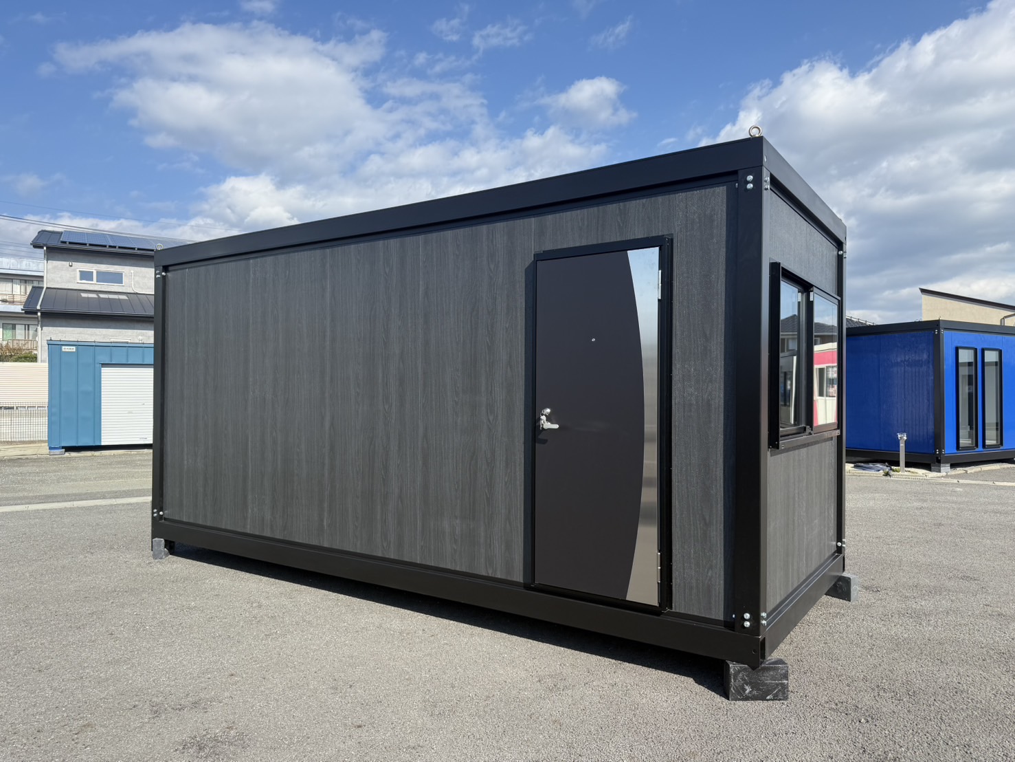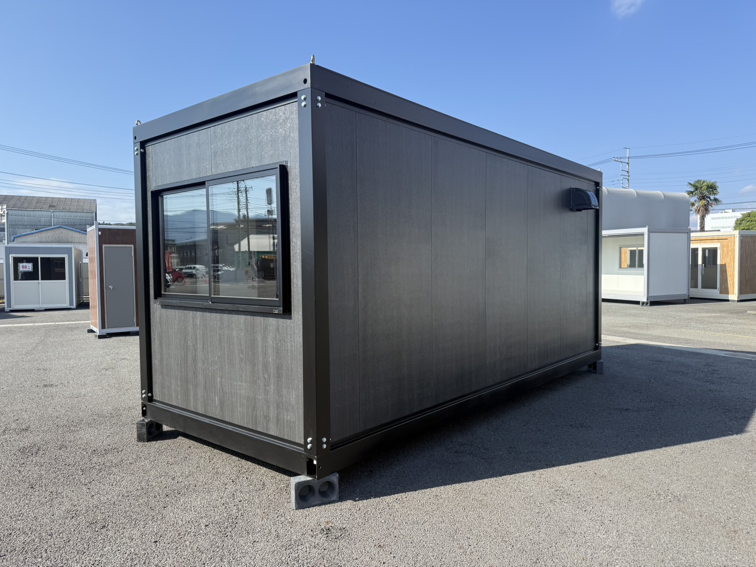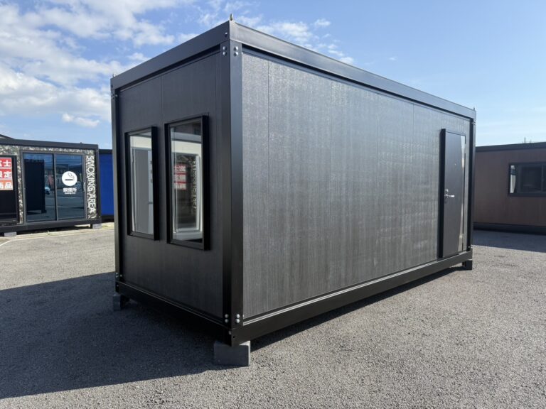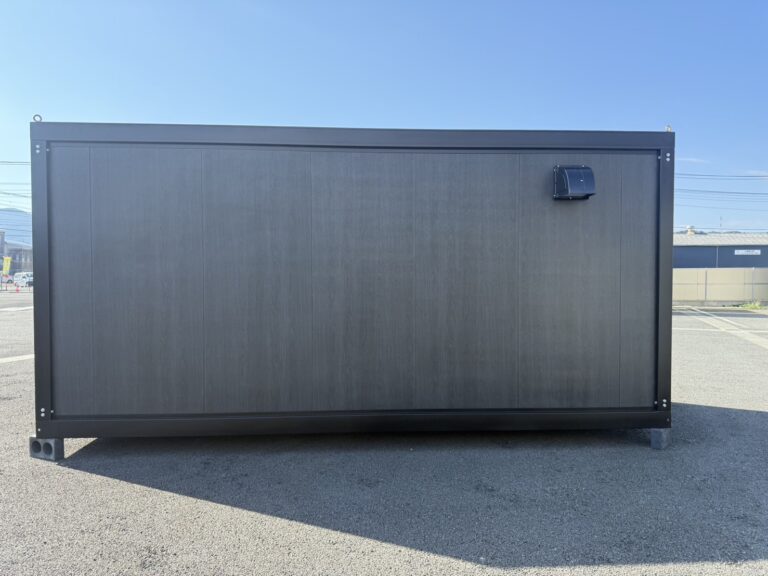 スタイリッシュな外観が目を惹く、木目ブラックパネル仕様のユニットハウスです。