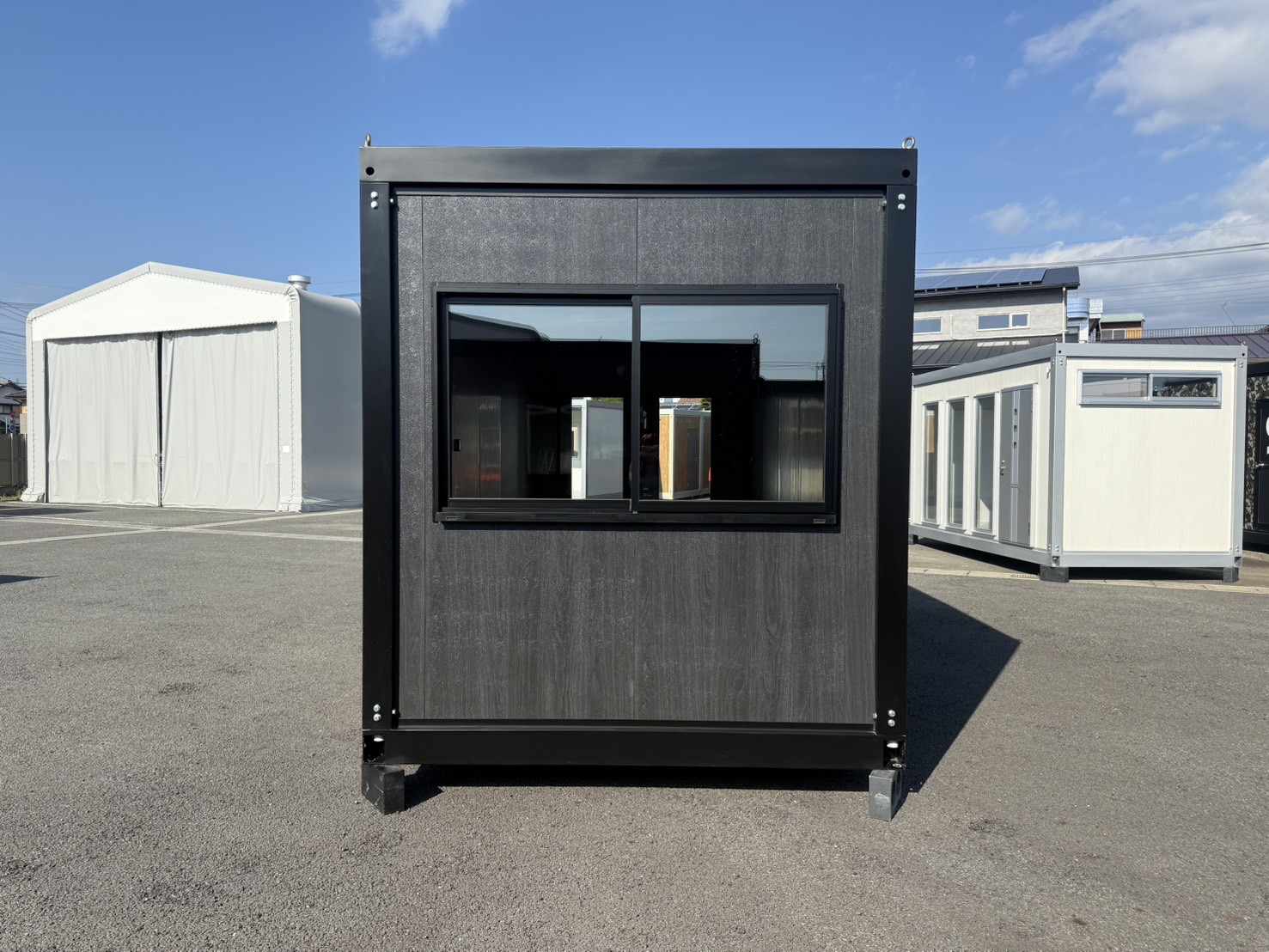 落ち着いたトーンの外壁とシンプルなスクエアデザインがオフィスや店舗、趣味部屋などに最適です。