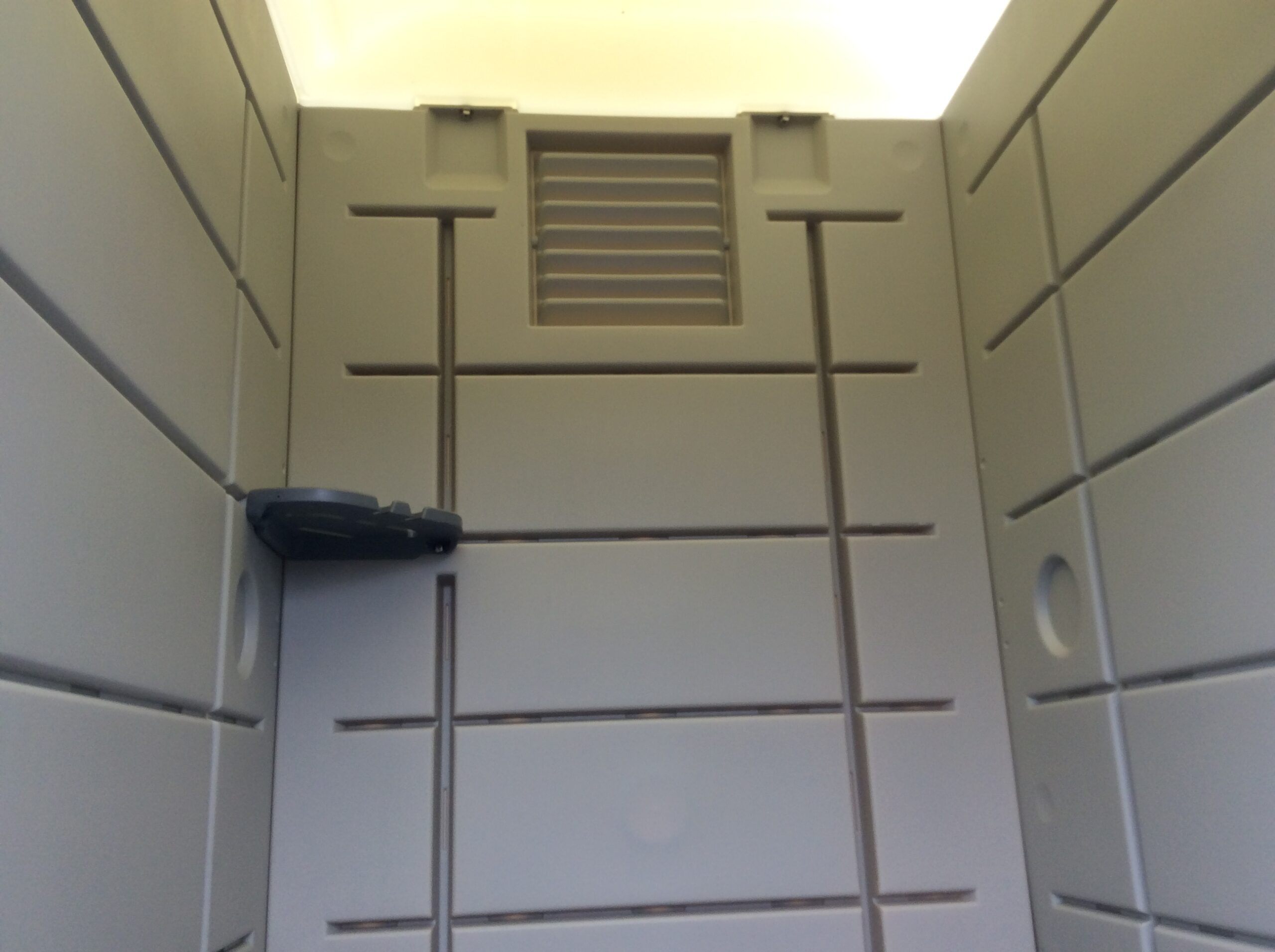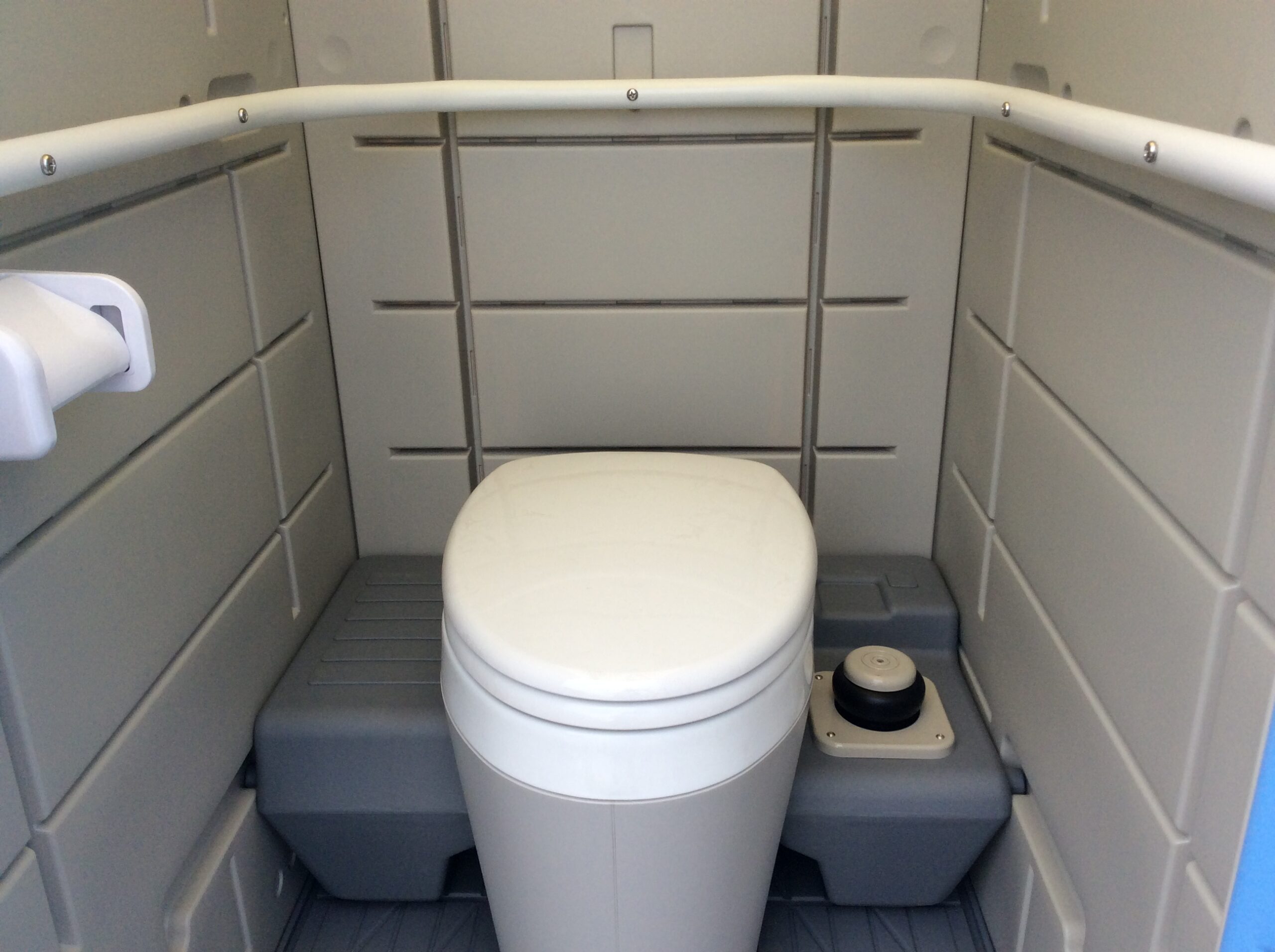 給水タンクに水を入れて、フットポンプで水を流す簡易水洗式のトイレです。