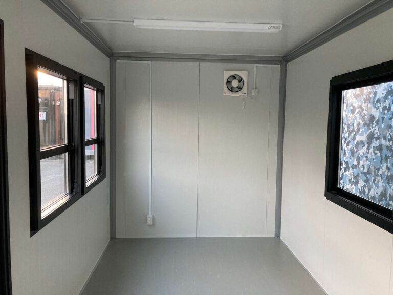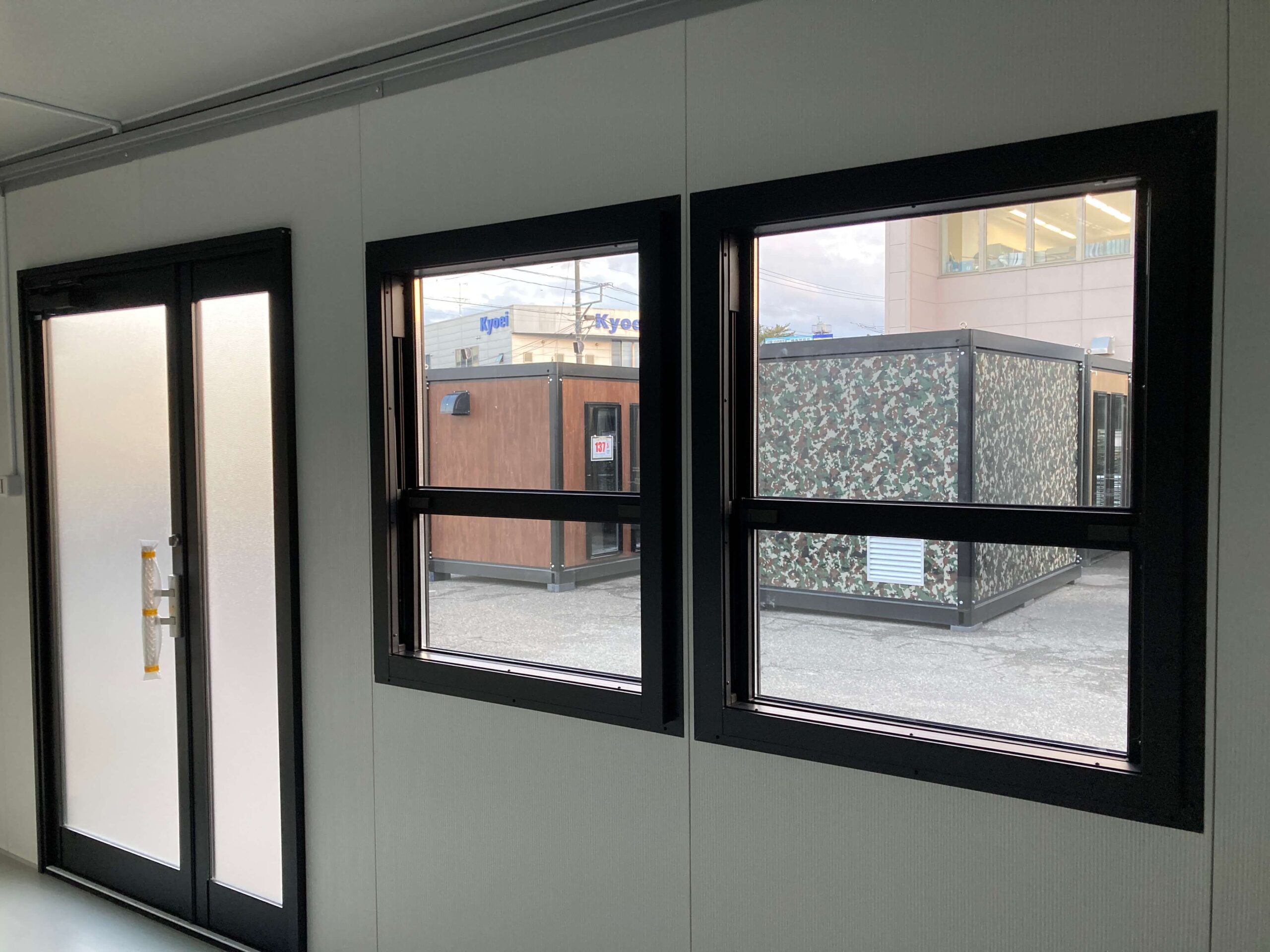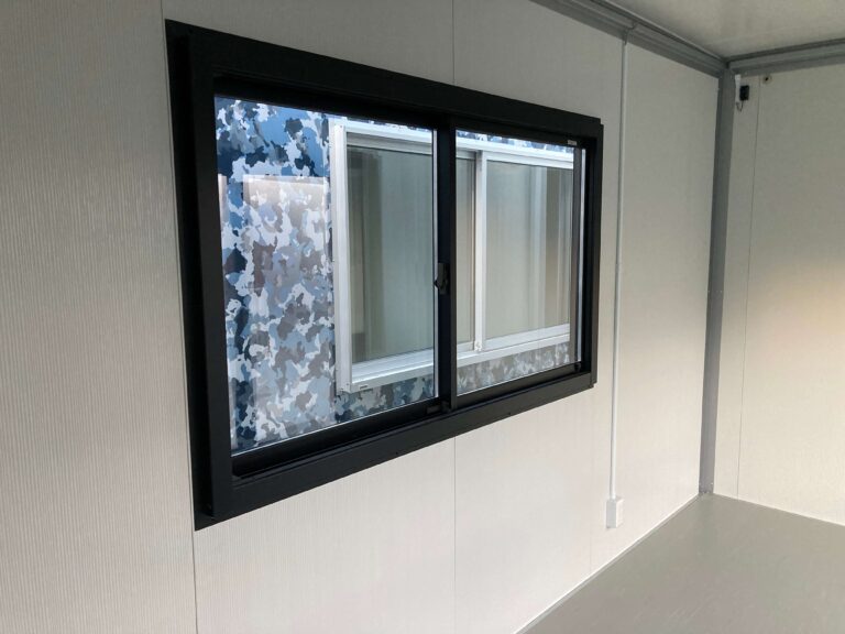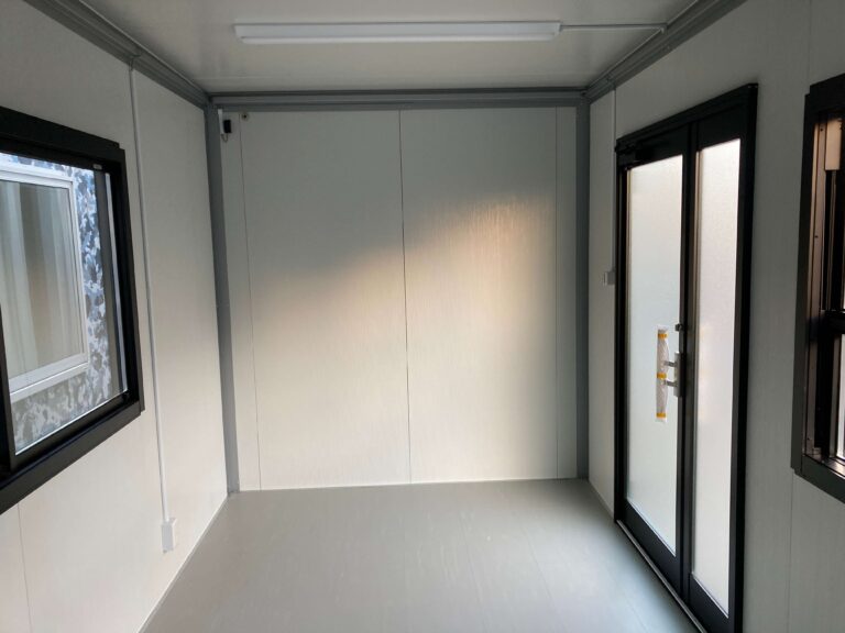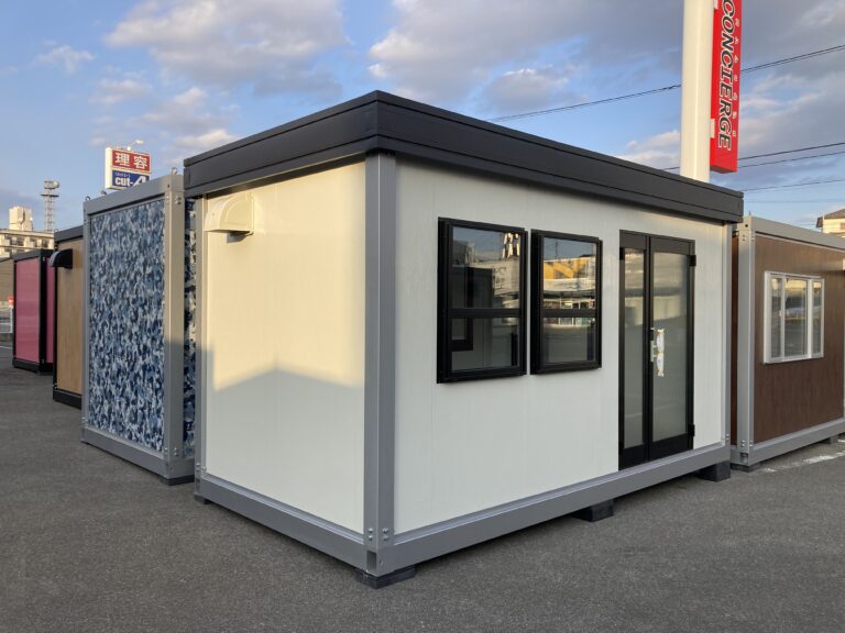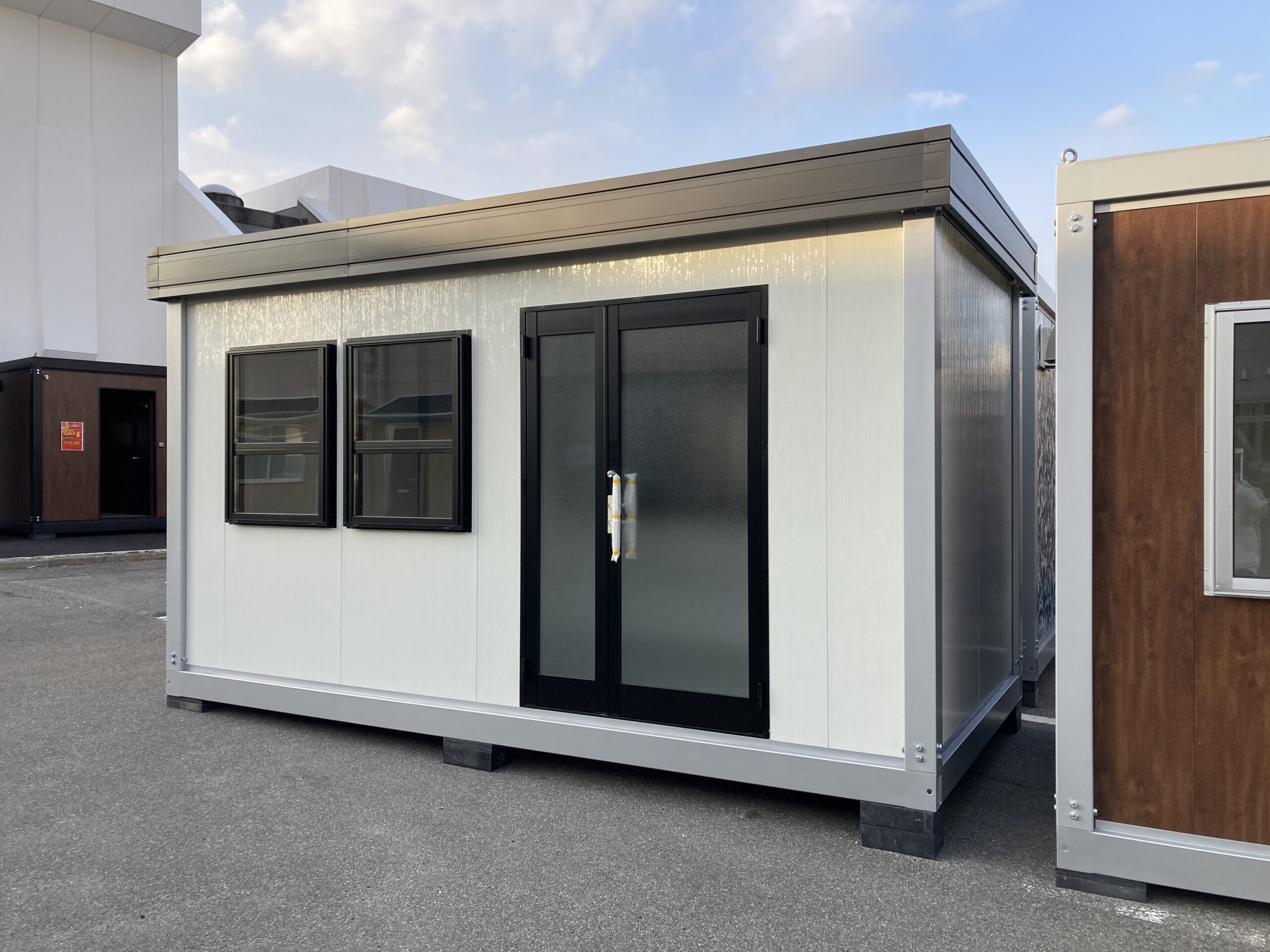 ホワイトエンボスの外壁にシルバーフレームを組み合わせたスタイリッシュな3.1坪のプレハブユニットハウスが入荷しました。