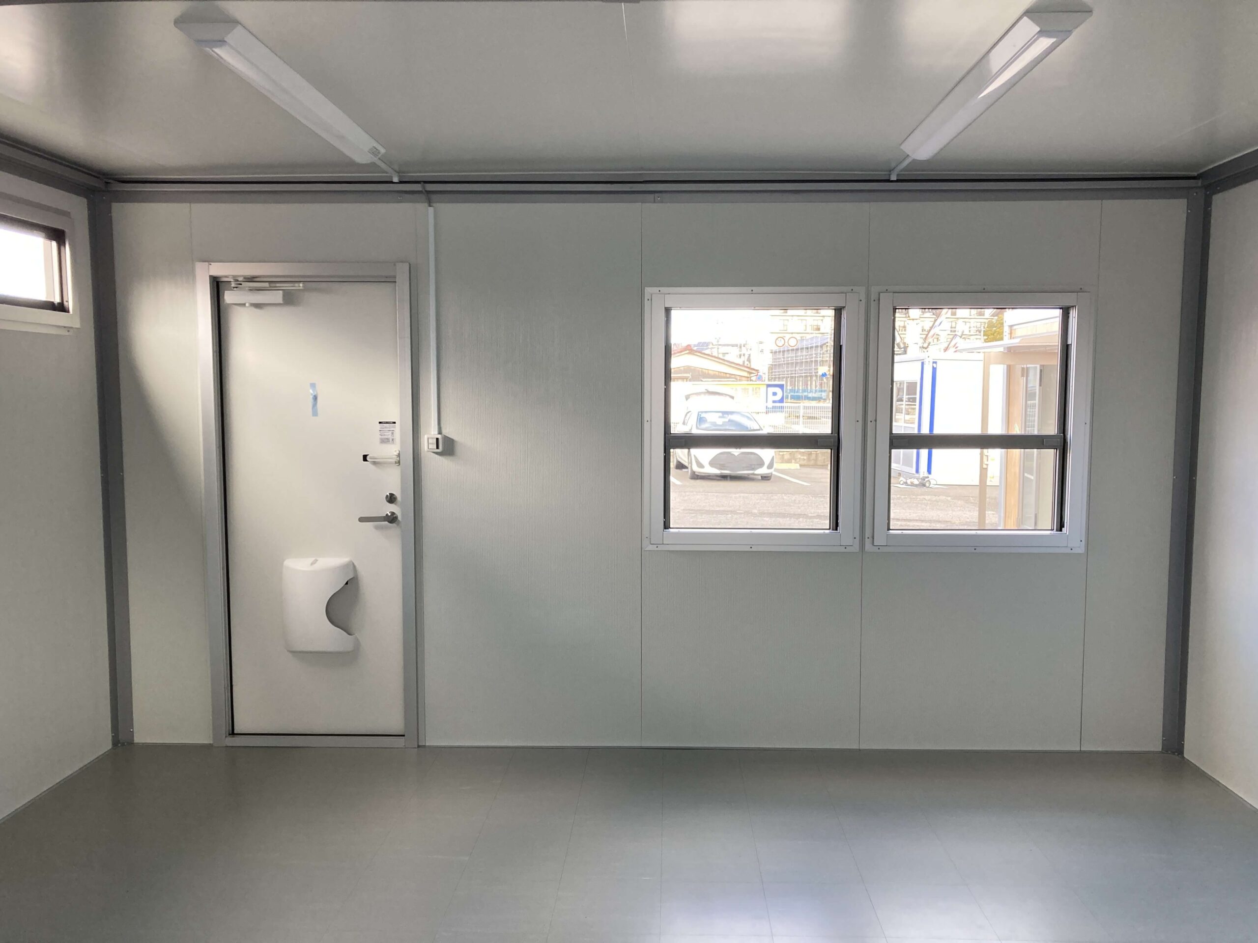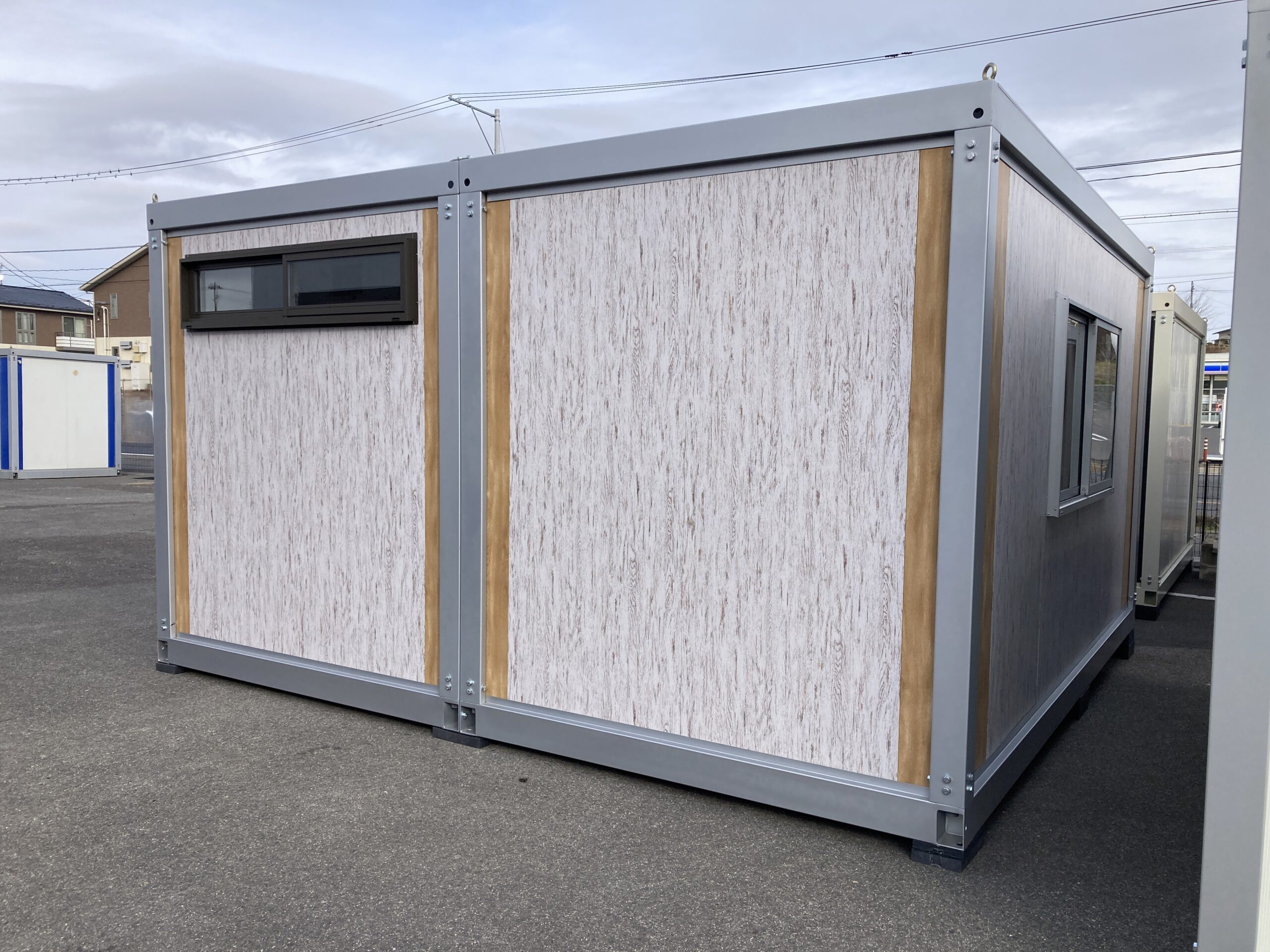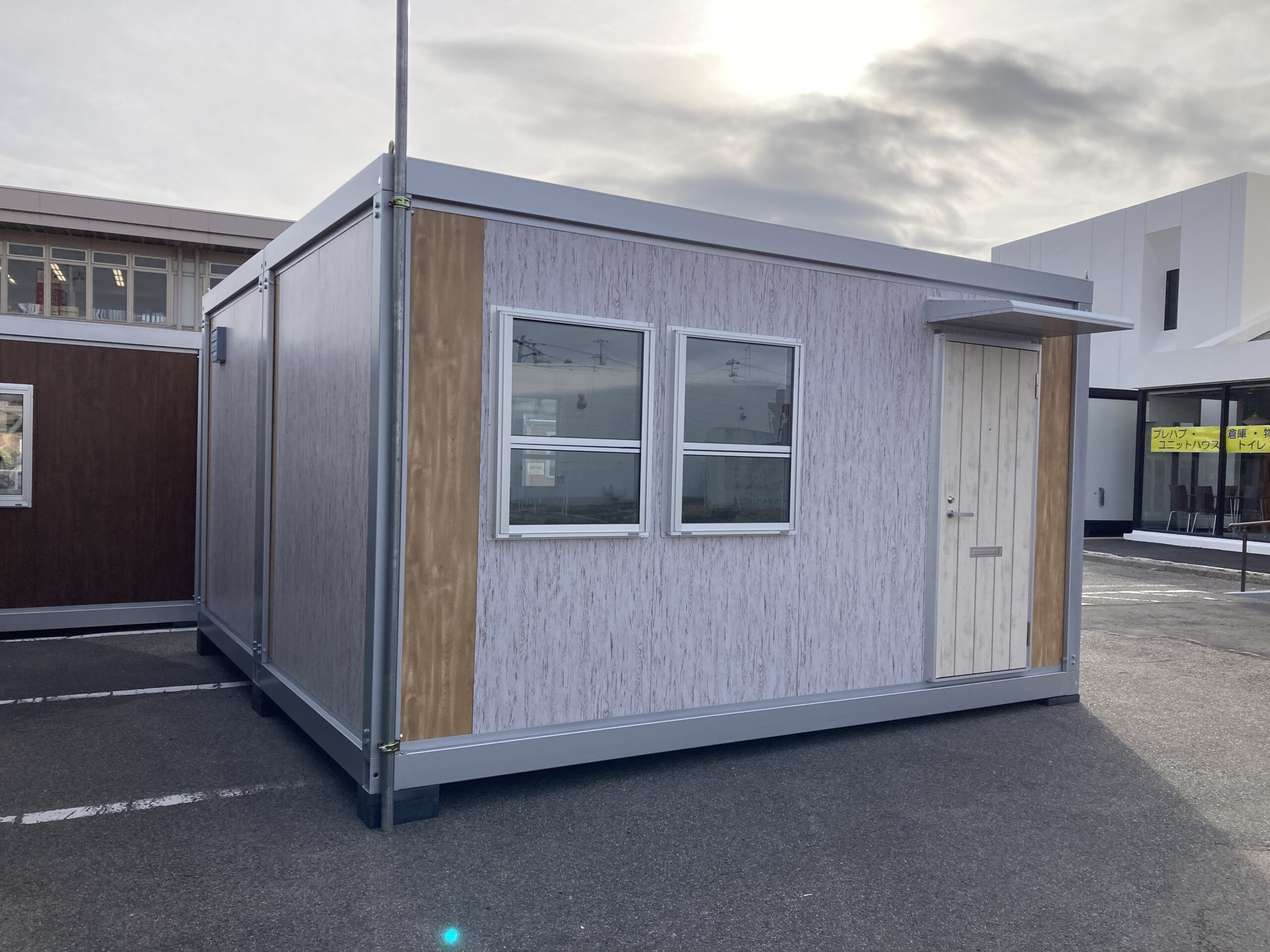 デスクやキャビネットを効率よく配置でき、使いやすさを重視したレイアウトが可能な、正方形に近い間取りのユニットハウスです。