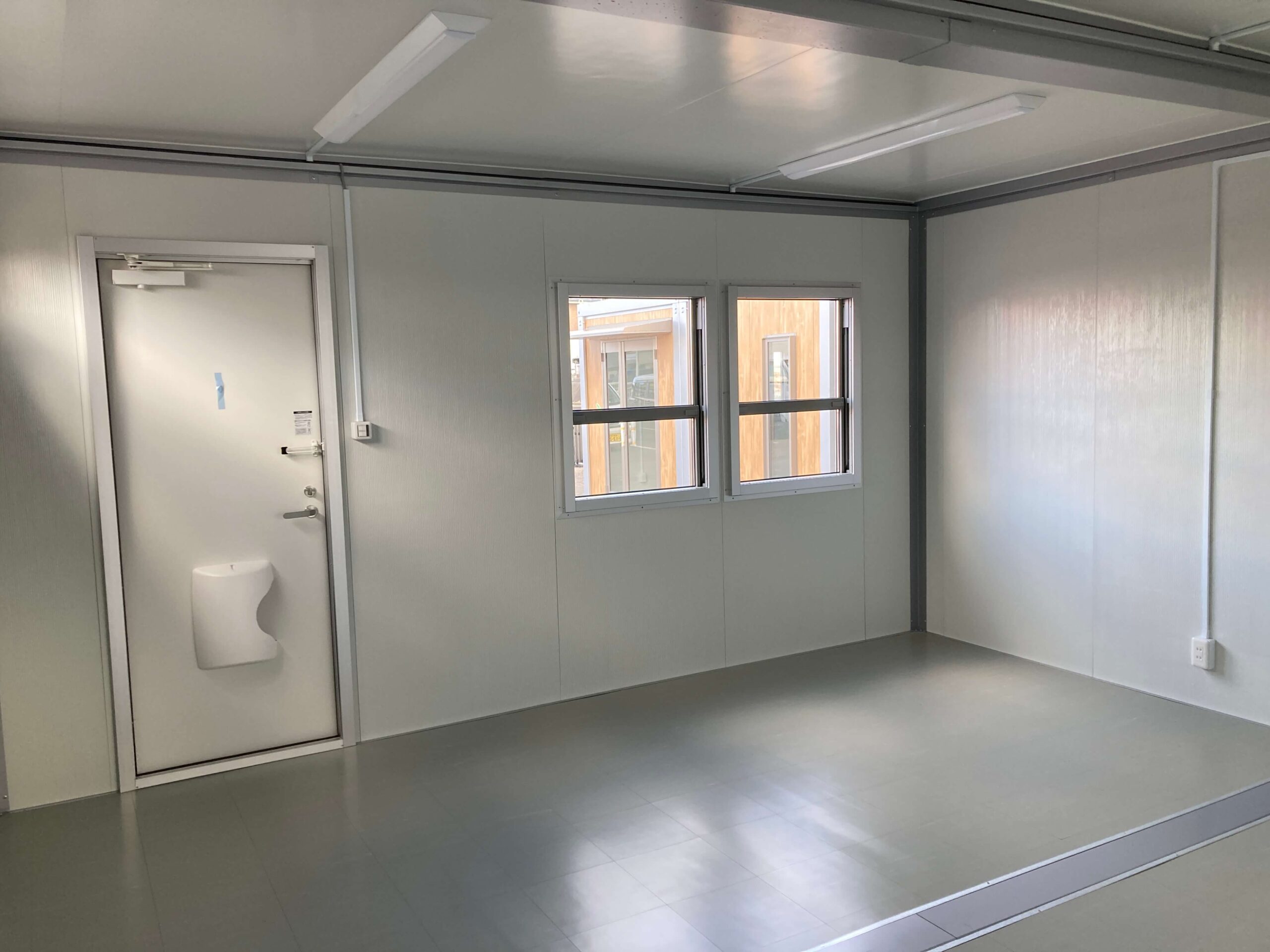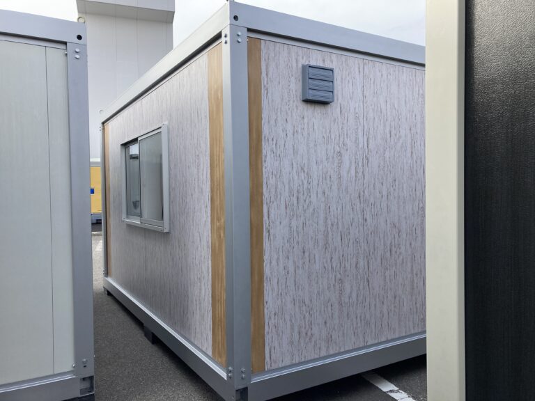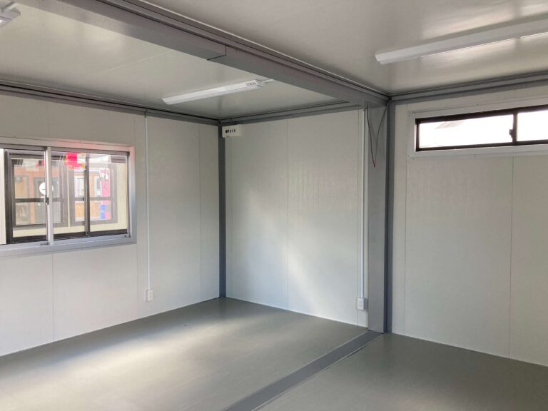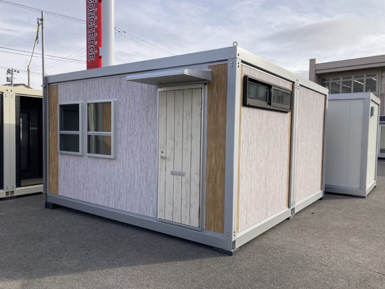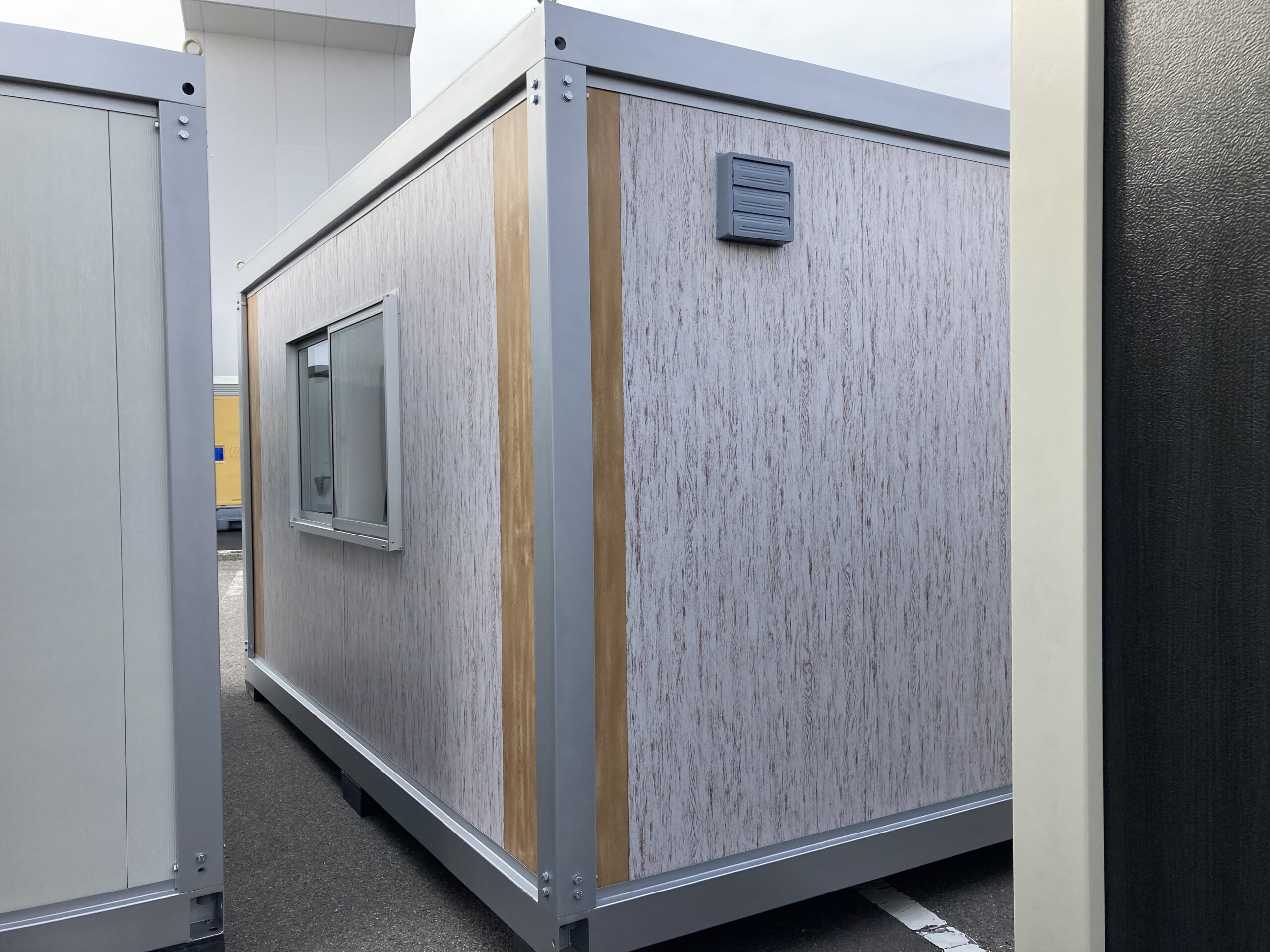 デスクやキャビネットを効率よく配置でき、使いやすさを重視したレイアウトが可能な、正方形に近い間取りのユニットハウスです。