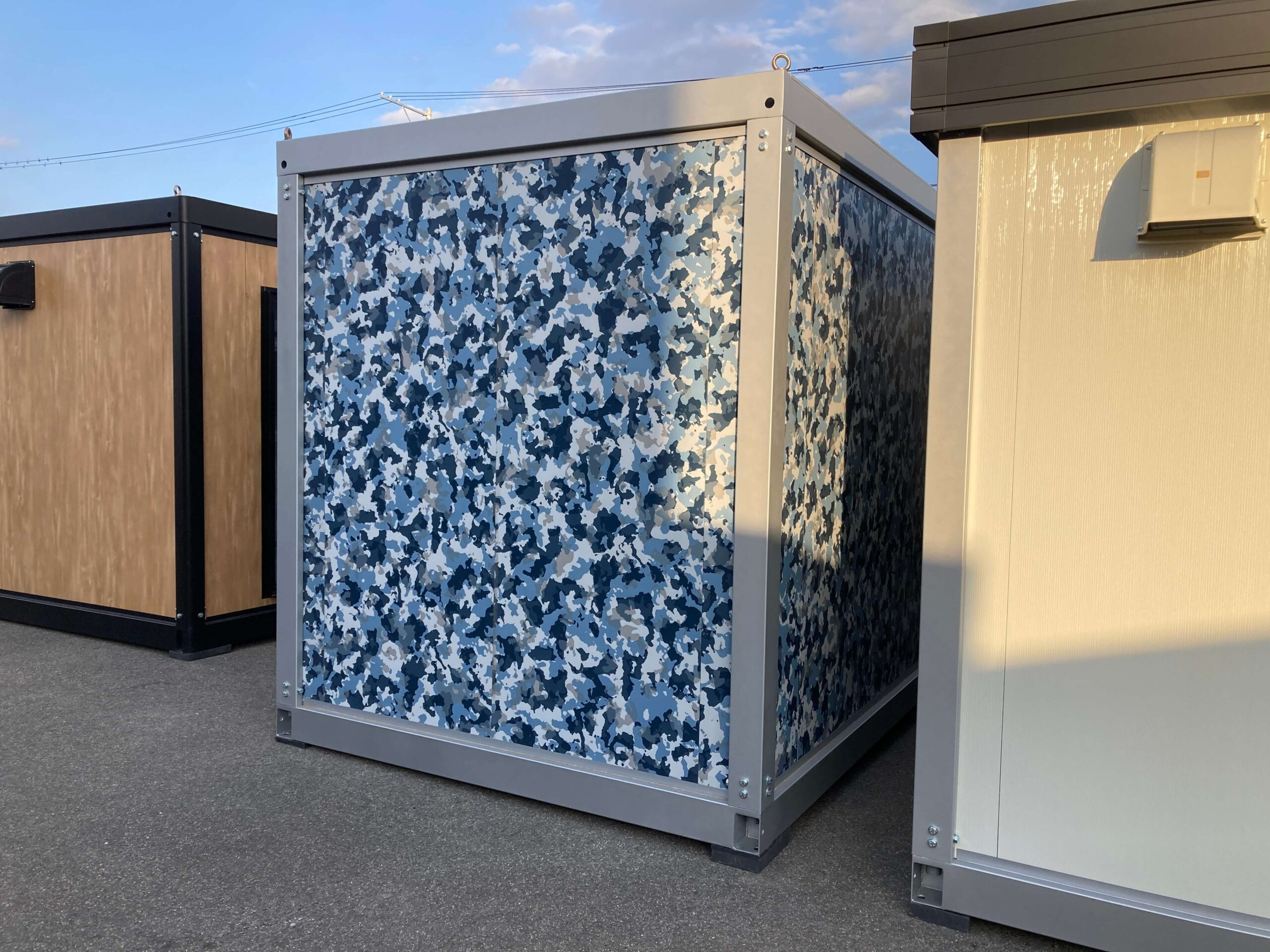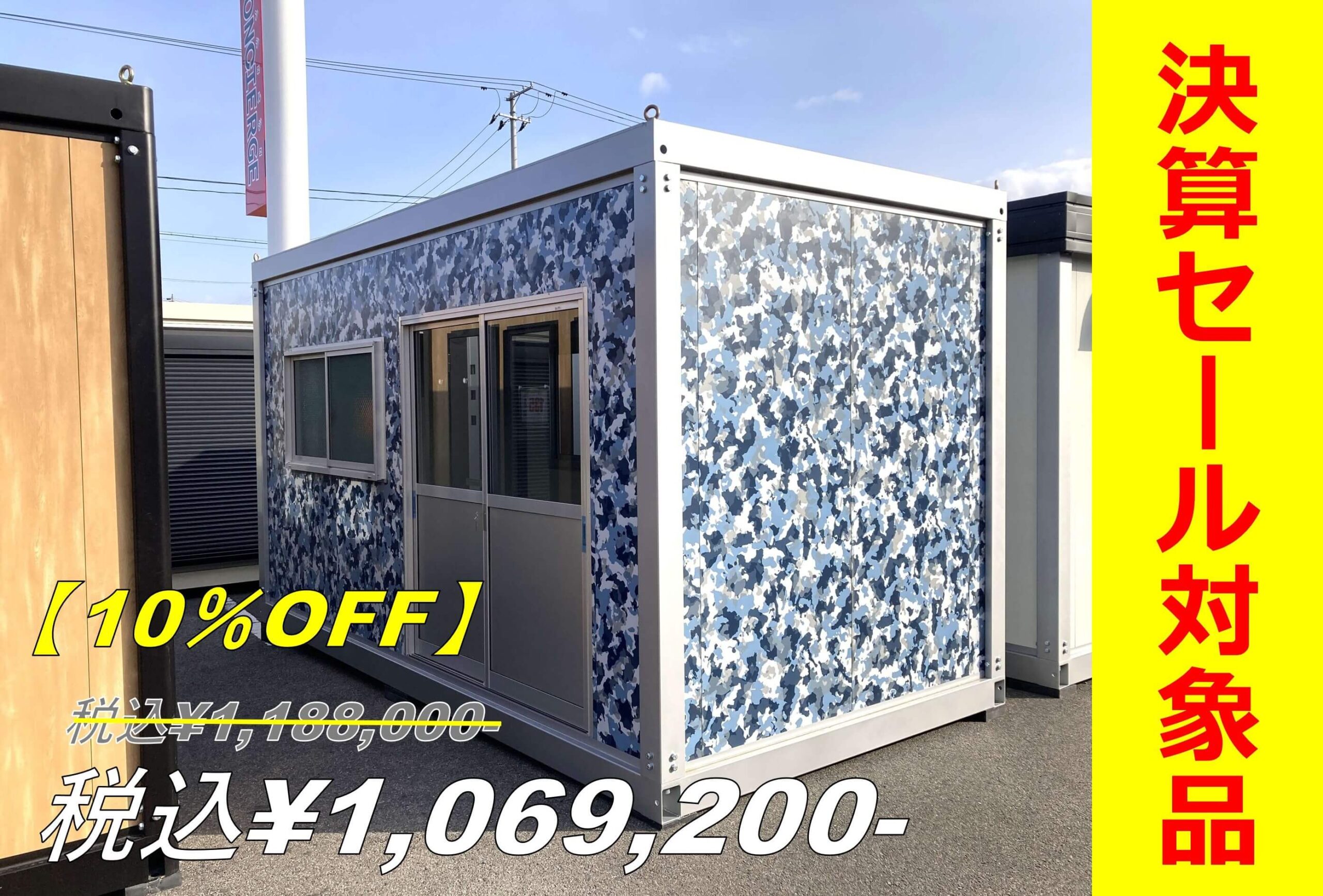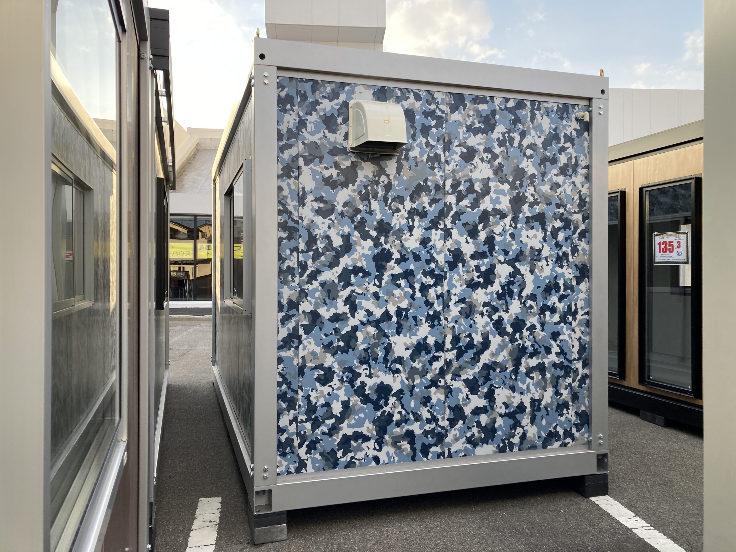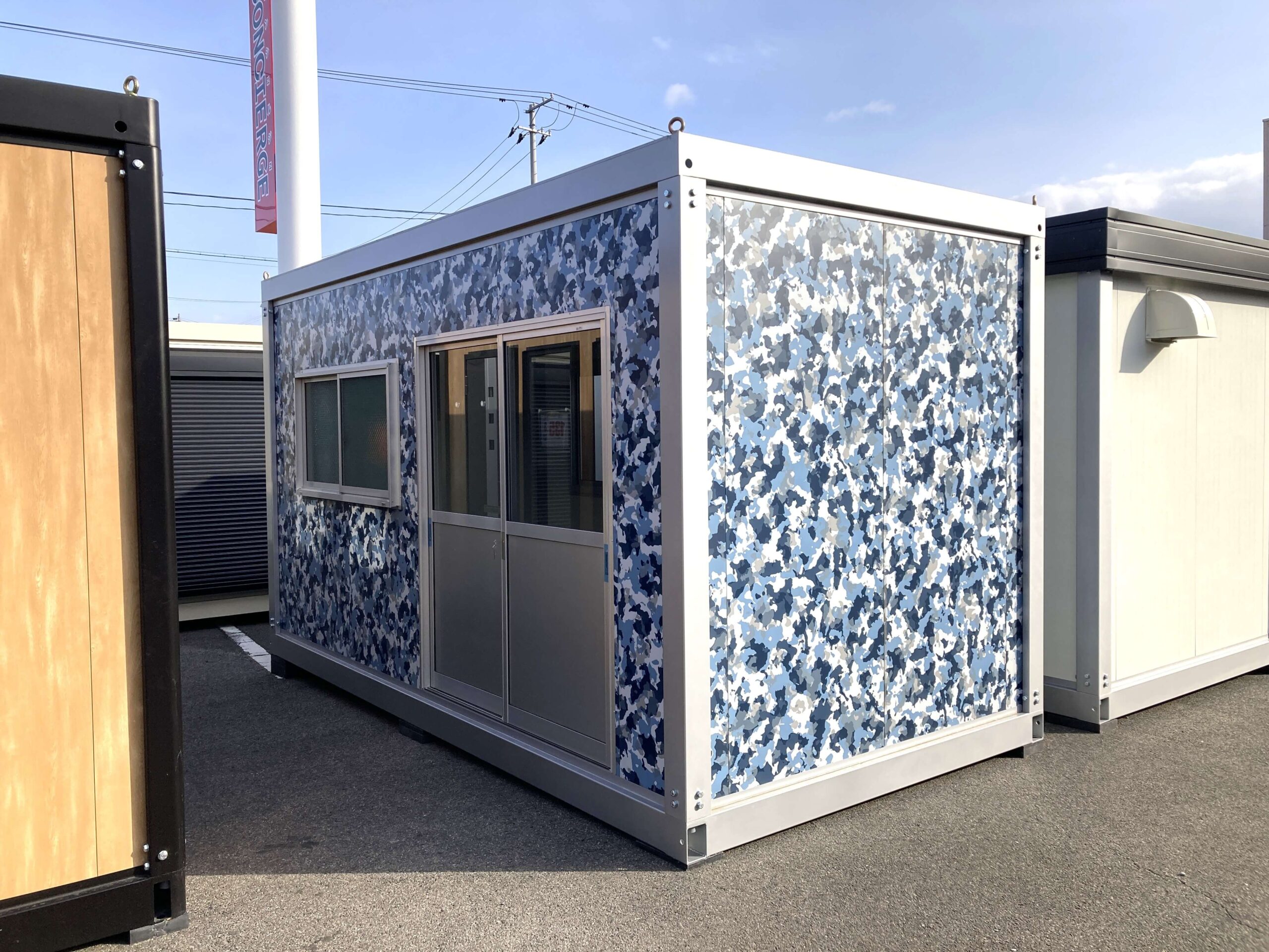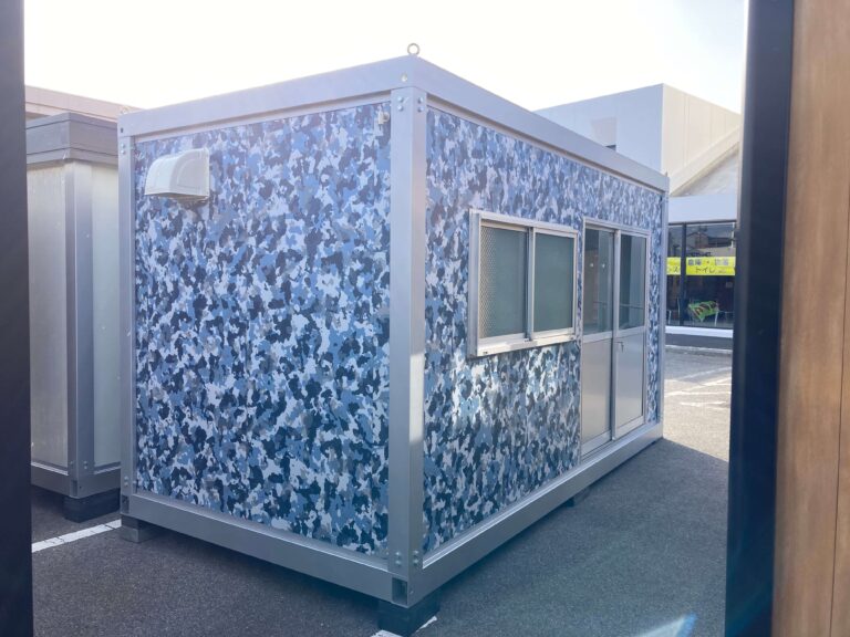 ブルーがベースの迷彩の壁が印象的な3.1坪のプレハブユニットが入荷しました。