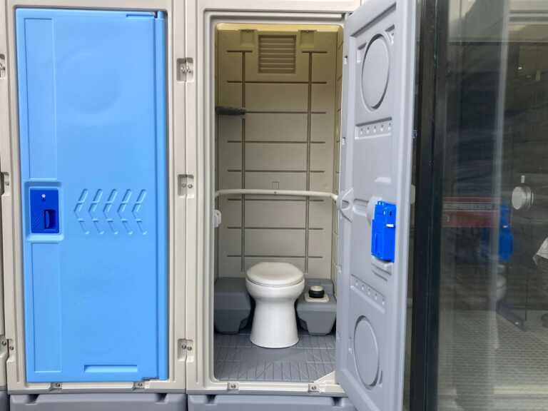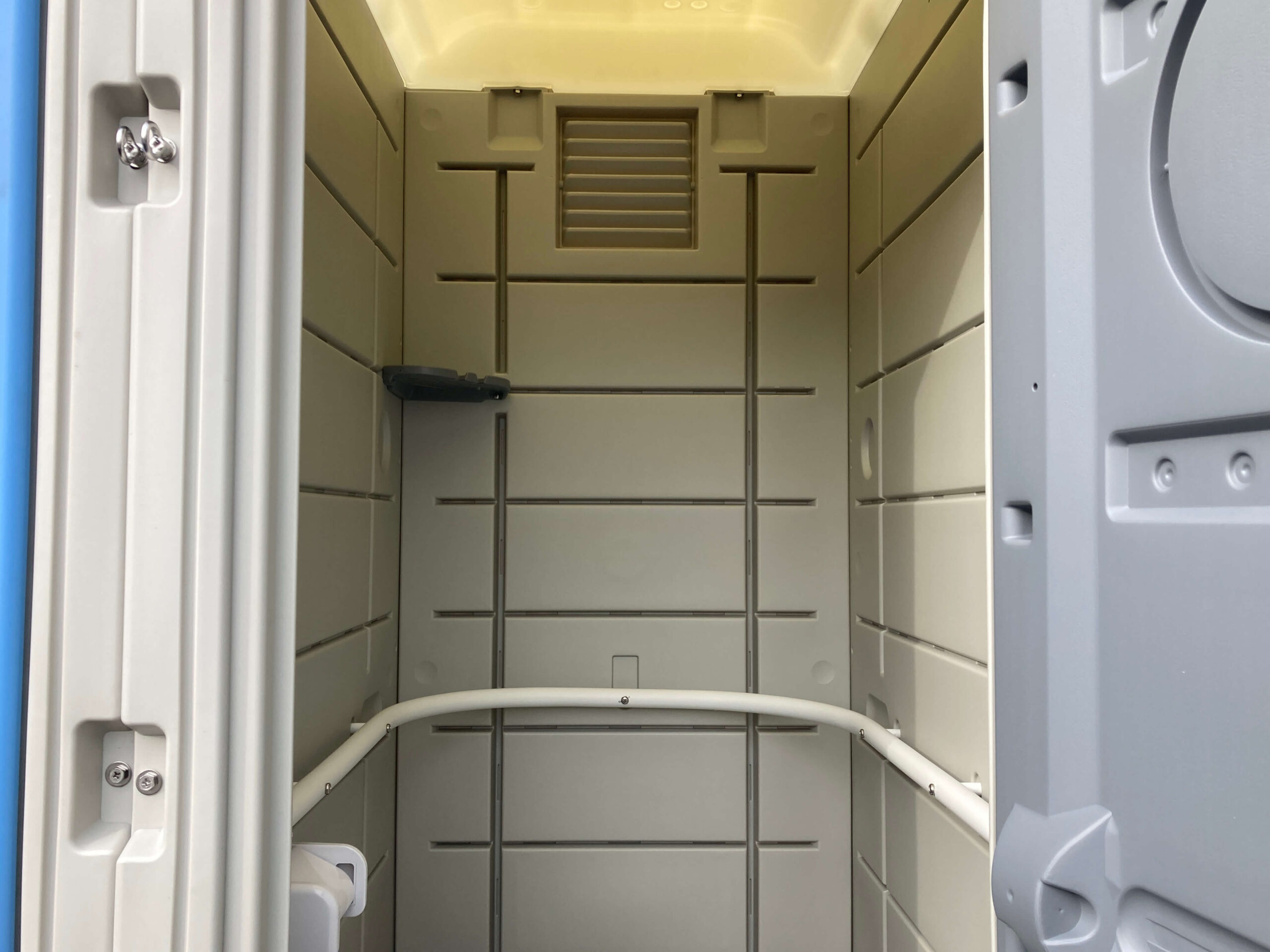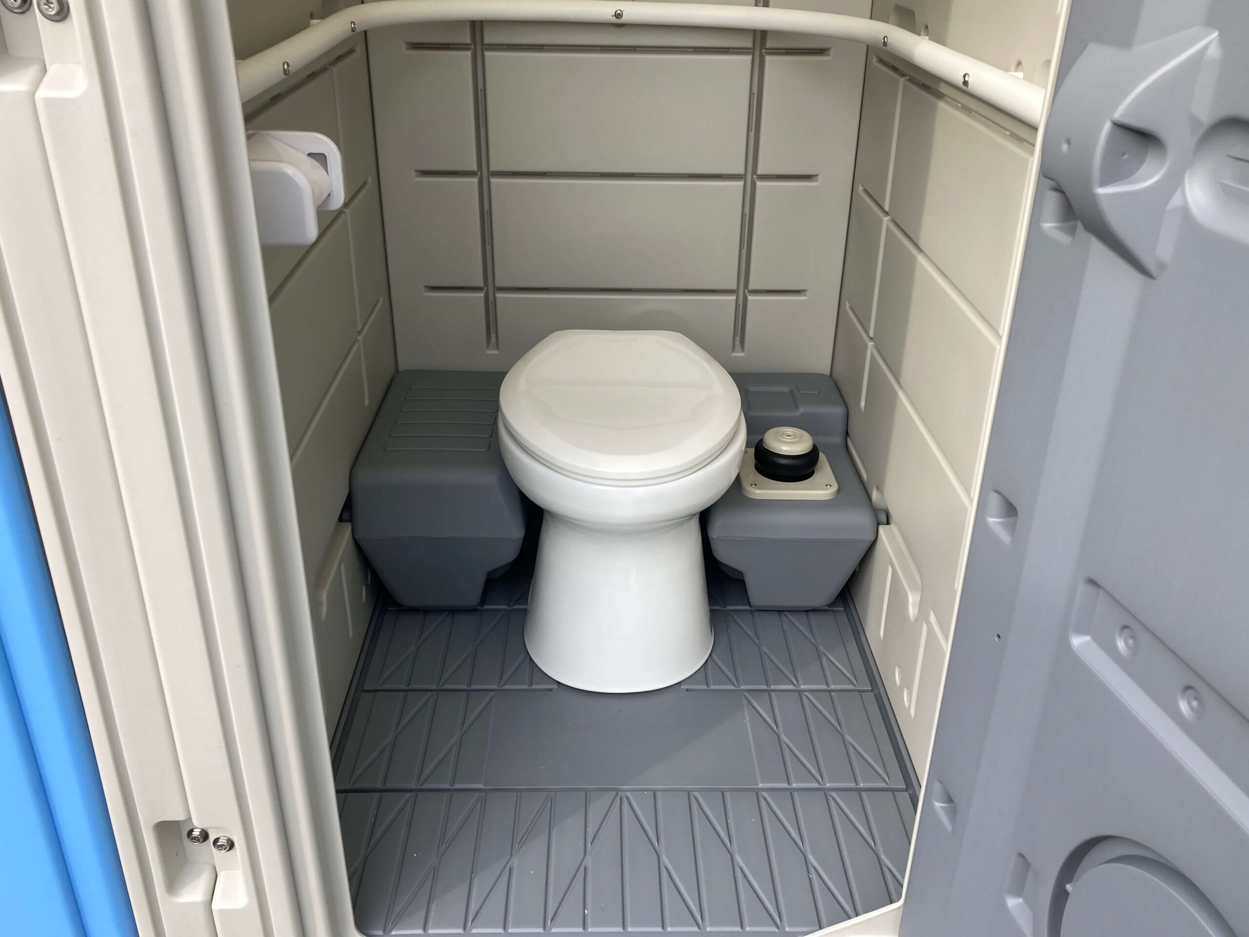 本体に給水タンクが内蔵されており、フットポンプで水を流すタイプの簡易水洗式トイレです。