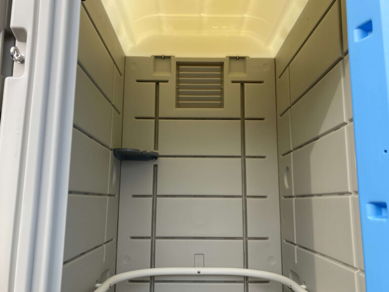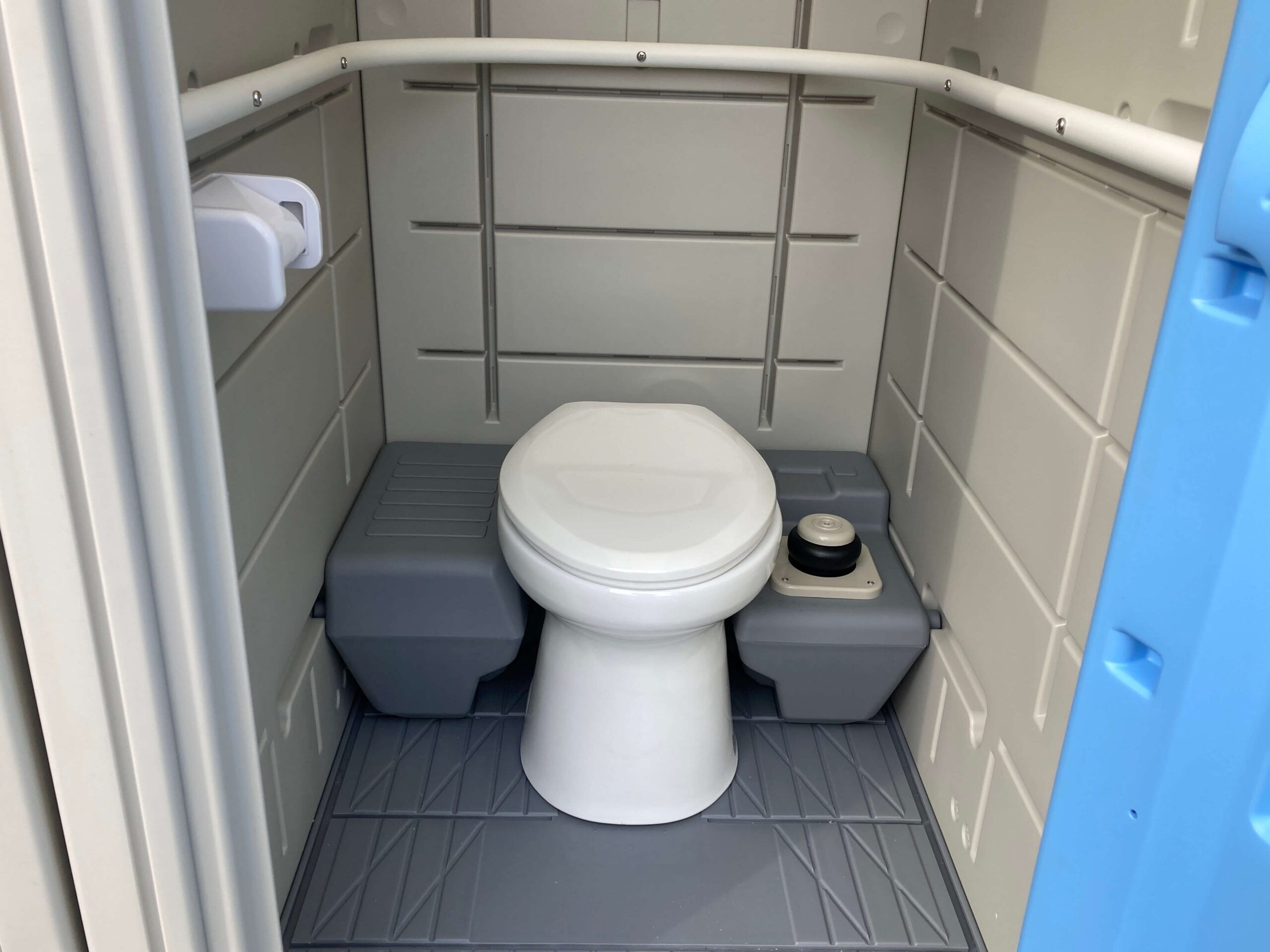 本体に給水タンクが内蔵されており、フットポンプで水を流すタイプの簡易水洗式トイレです。