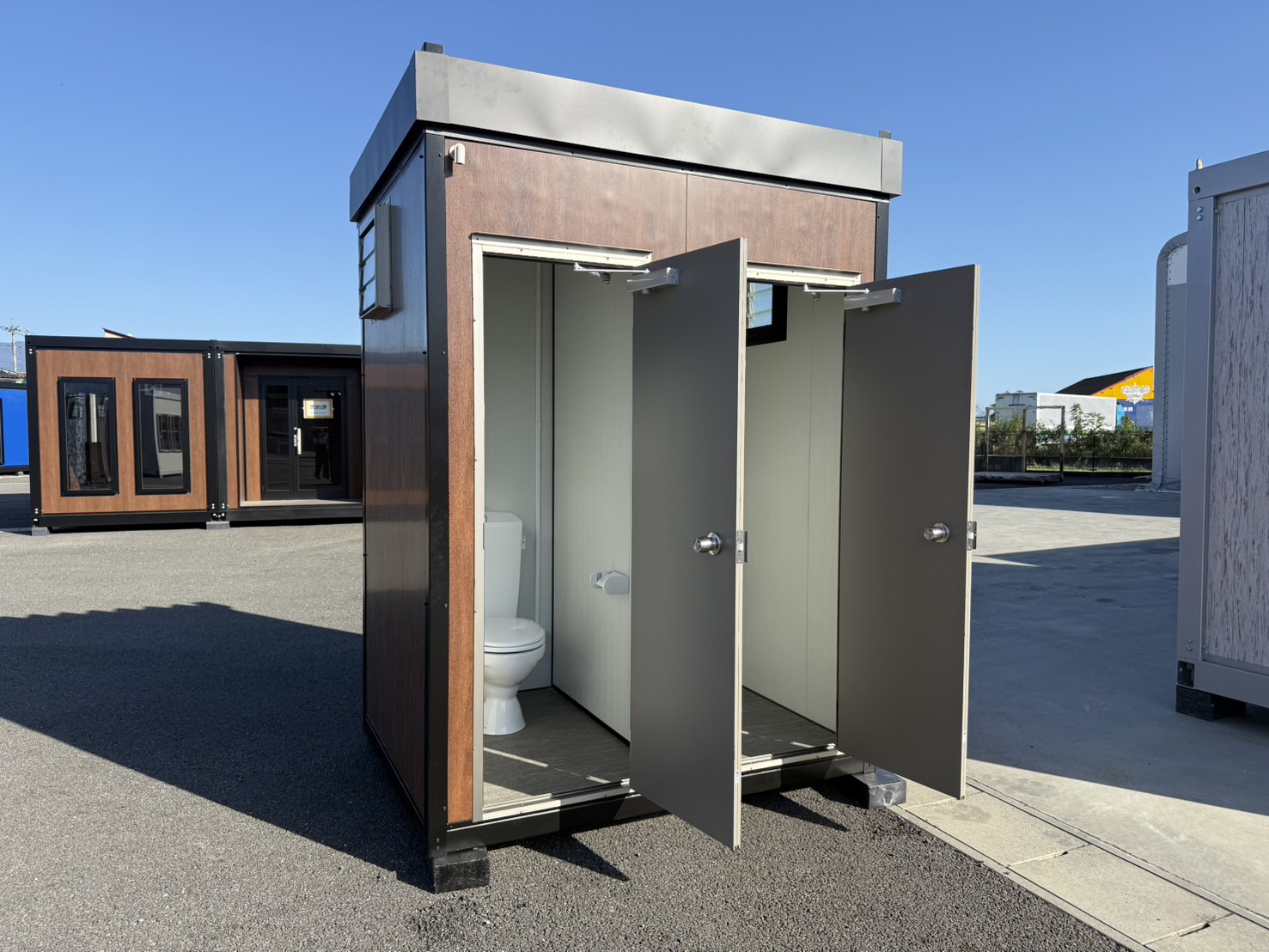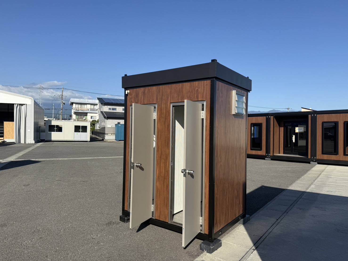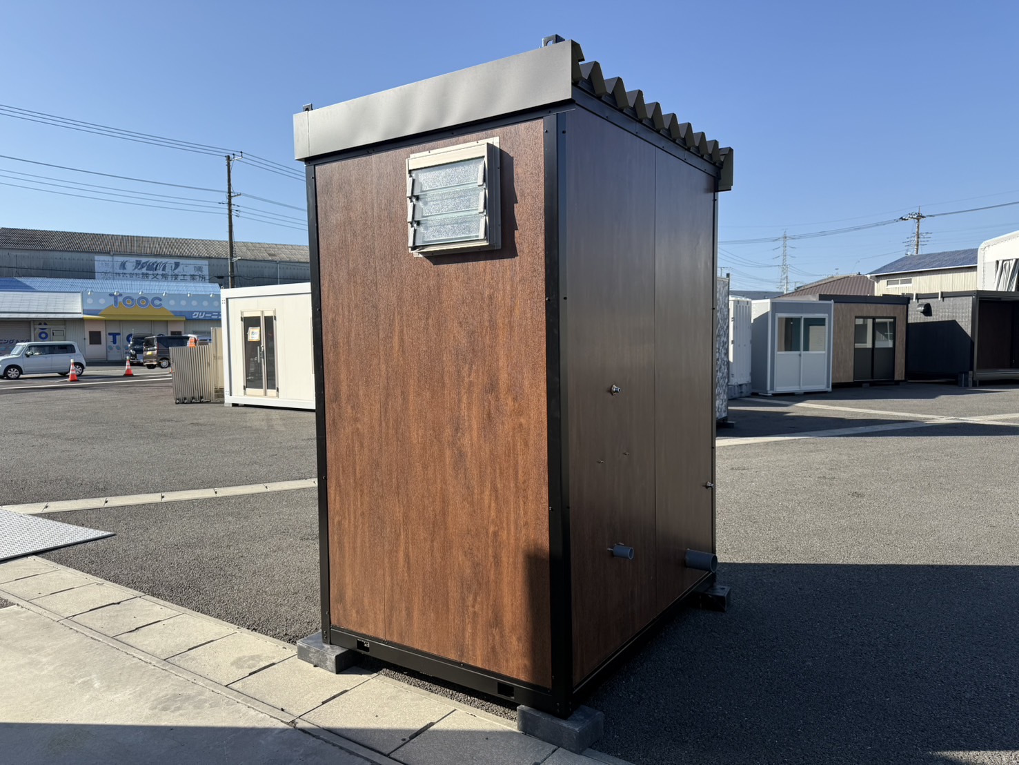 外観は木目調パネルにブラックフレームを組み合わせ、仮設トイレっぽさを感じさせない落ち着いたデザイン。工場や建設現場はもちろん、人の目に触れる場所でも違和感なく設置できます。