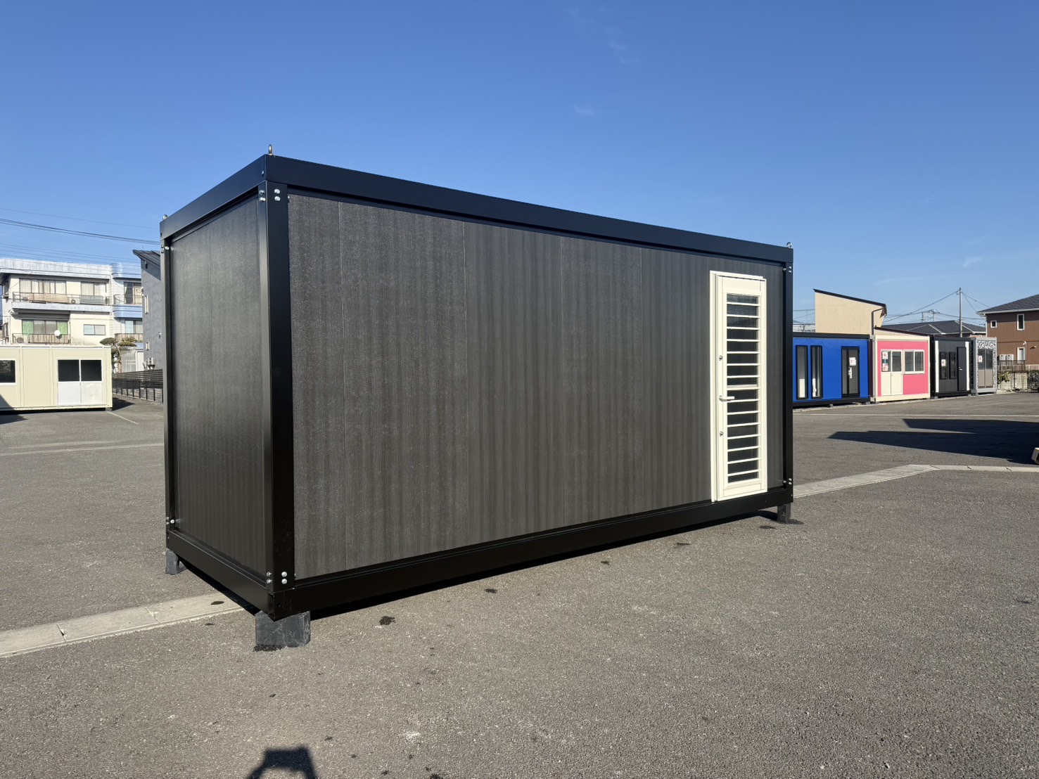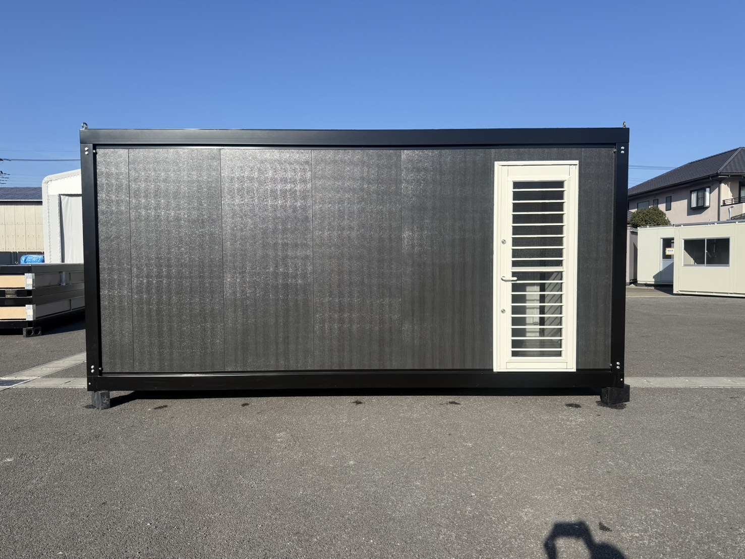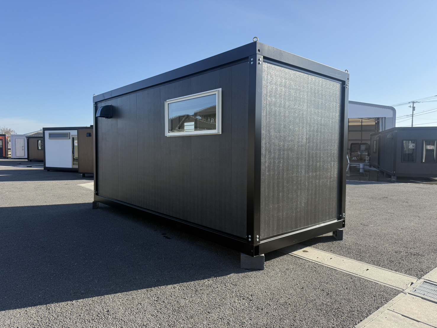 ブラックフレームにブラック木目調パネルを合わせた、統一感のあるスタイリッシュなユニットハウス。