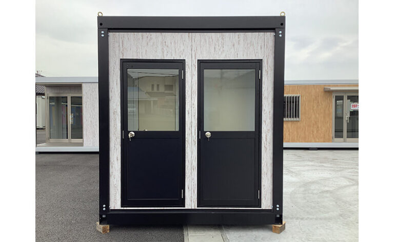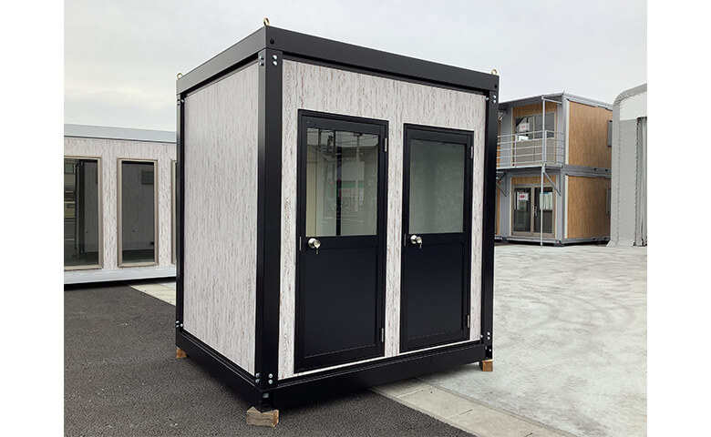木目調のシラカバパネルとブラックのフレームでオシャレな外観の1.4坪トイレハウスです。